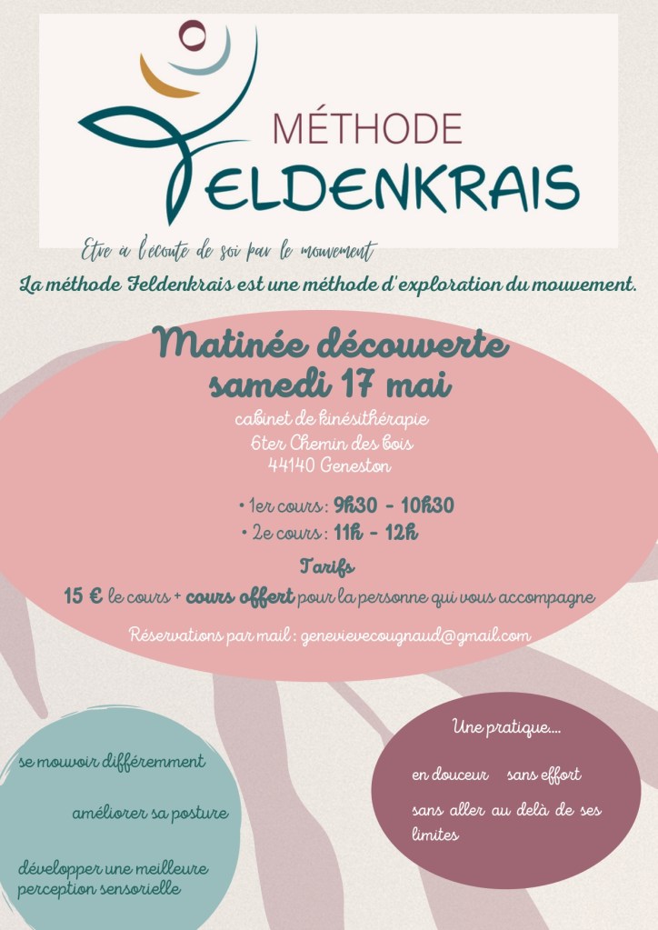 La Méthode Feldenkrais, du nom de son créateur, est une méthode d’exploration du mouvement. Elle nous propose de porter notre attention au chemin que nous empruntons lors de l’exécution d’un mouvement. L’essentiel n’est pas la réussite de celui-ci mais l’attention portée à notre ressenti tout au long de sa réalisation. Il est important d’être à l’écoute de soi pour que le mouvement soit effectué sans effort, sans aller au-delà de ses limites, en douceur… Une pratique régulière modifie positivement l’image de soi, contribue à une meilleure connaissance de soi-même dans sa globalité. La Méthode Feldenkrais se pratique sous deux formes : les séances collectives ou leçons de PCM (Prise de Conscience par le Mouvement) ou les séances individuelles ou l’IF (Intégration Fonctionnelle)